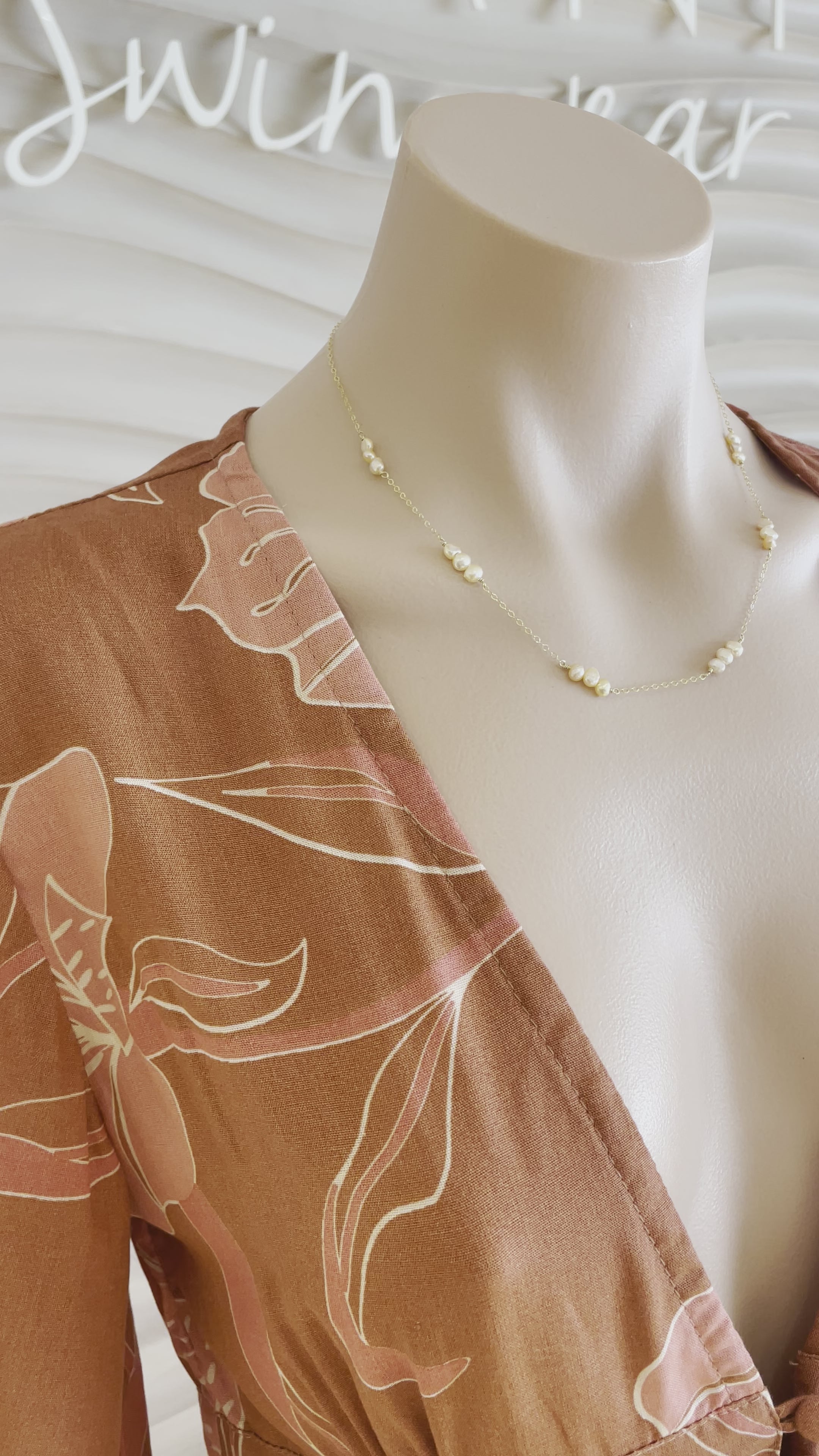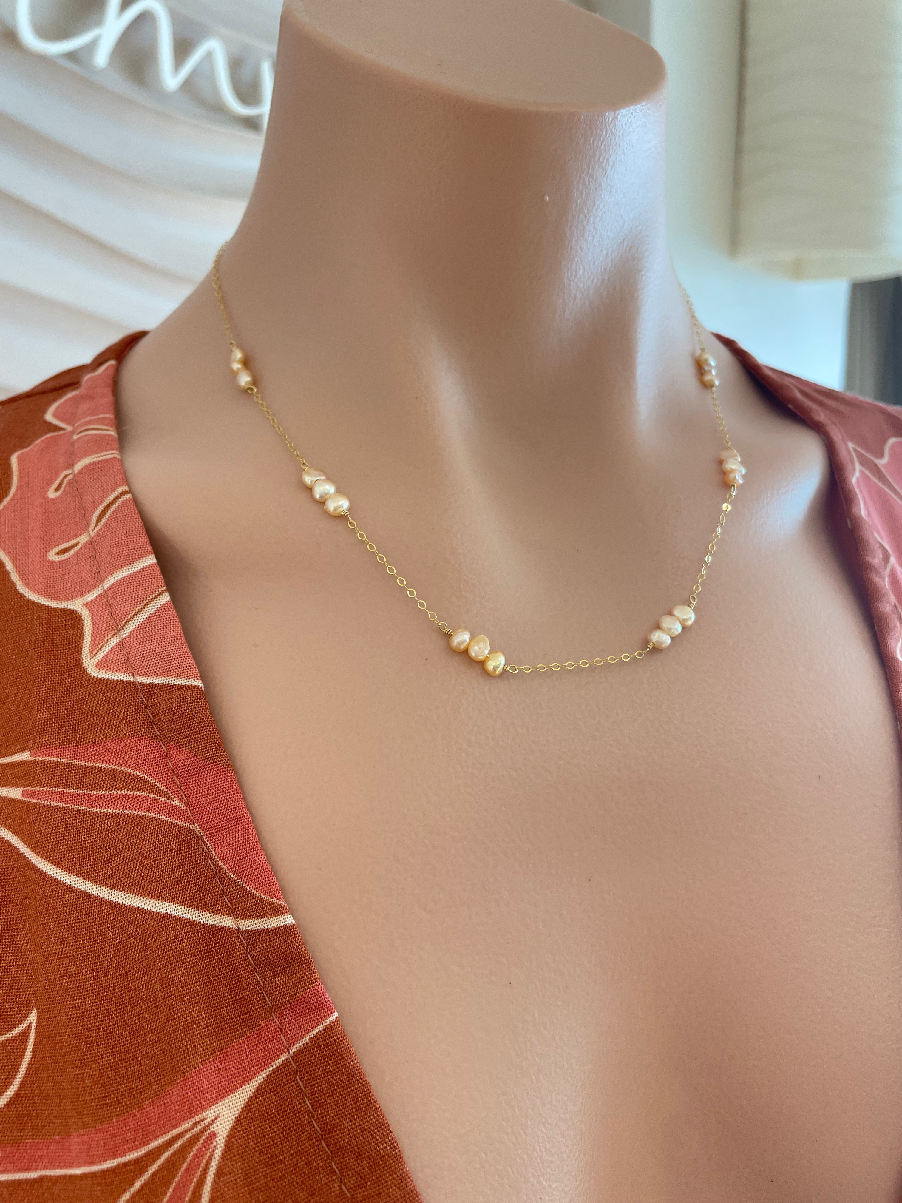 This Pearl Dreams Necklace is a beautiful addition to your jewelry collection. Crafted with 14K Gold Filled Chain and genuine pink Keshi pearls, this elegant necklace will turn heads. Our adjustable chain length ensures a perfect fit, ranging from 16" to 18".