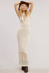 A bohemian chic sleeveless midi-long length knit dress featuring crochet Macrame mesh details on the chest and hem, with ribbed collar and sleeve accents. It is designed with a slim-fit silhouette, perfect for accessorizing and channeling a Coachella-inspired look!